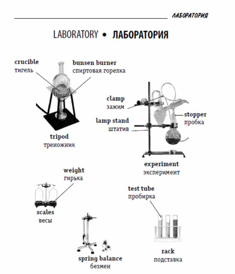 Иллюстрированный словарь английских слов облегчает усвоение новой лексики. Это пособие выгодно отличает от других подобных книг сочетание двух принципов – основательность и наглядность. Таким образом он поможет не только овладеть правилами грамматики английского языка, но и значительно расширить словарный запас. Пособие адресовано всем, кто учит английский язык в школе, вузе, на курсах или самостоятельно. Тема №49. Лаборатория