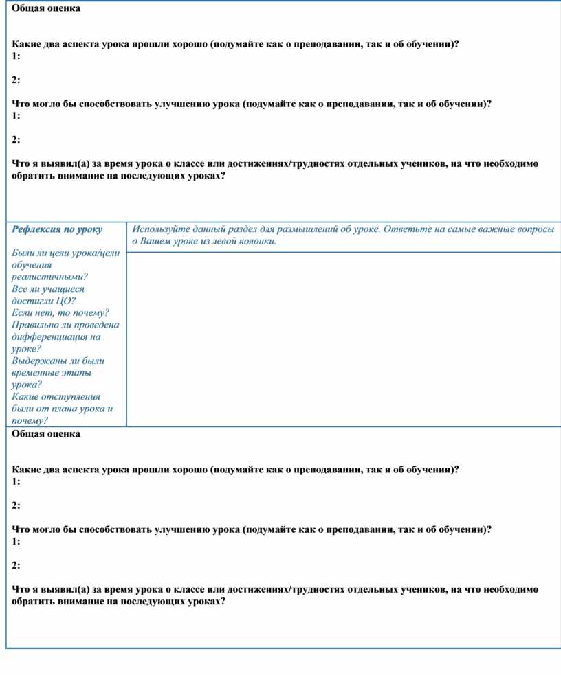 Используйте данный раздел для размышлений об уроке. Ответьте на самые важные вопросы о Вашем уроке из левой колонки. |
