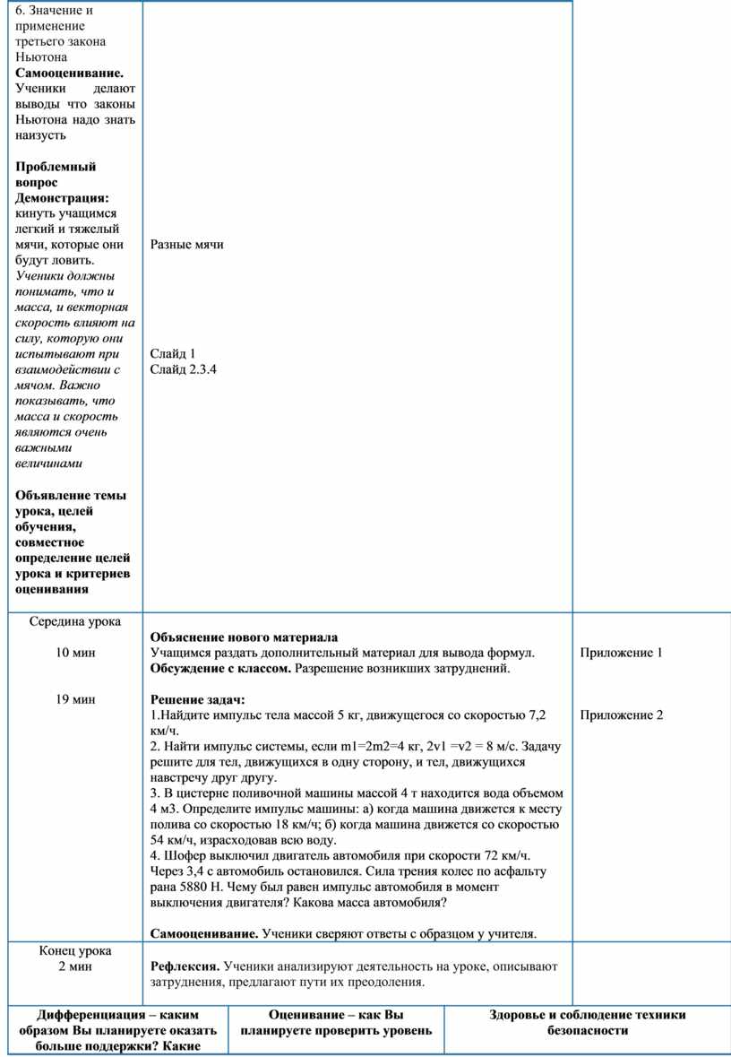 Учащиеся могут: -понимать письменные указания для исследования закона сохранения энергии и импульса, отвечать на вопросы о его результатах в устной и письменной форме. Лексика и терминология, специфичная для предмета: -масса, импульс, векторная скорость, сила, упругое столкновение (удар), неупругое столкновение (удар), кинетическая энергия, потенциальная энергия, энергия упругой деформации. Полезные выражения для диалогов и письма: Какое тело имеет больший импульс? Как изменилась……….энергия? Предположите, что случиться с действием, когда….. |