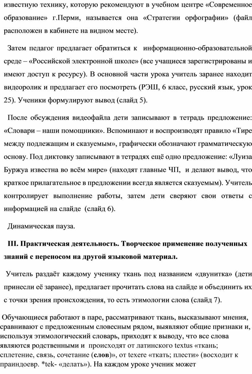 Обучающиеся работают в паре, рассматривают ткань, высказывают мнения, сравнивают с предложенным словесным рядом, выявляют общие признаки и, используя этимологический словарь, приходят к выводу, что все слова являются родственными и происходят от латинского teхtus «ткань; сплетение, связь, сочетание (слов)», от texere «ткать; плести» (восходит к праиндоевр. *tek- «делать»). На каждом уроке ученик может воспользоваться любым словарём. В кабинете для этого отведена книжная полка, которая находится в свободном доступе. Внимательные обучающиеся услышали слово «этимология» и знают, в каком словаре искать необходимую информацию.