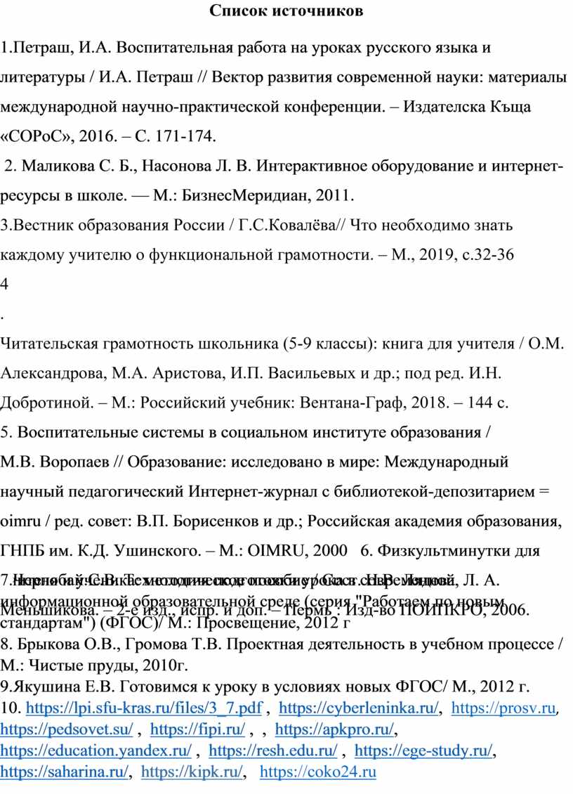 3.Вестник образования России / Г.С.Ковалёва// Что необходимо знать каждому учителю о функциональной грамотности. – М., 2019, с.32-36 4. Читательская грамотность школьника (5-9 классы): книга для учителя / О.М. Александрова, М.А. Аристова, И.П. Васильевых и др.; под ред. И.Н. Добротиной. – М.: Российский учебник: Вентана-Граф, 2018. – 144 с. 5. Воспитательные системы в социальном институте образования / М.В. Воропаев // Образование: исследовано в мире: Международный научный педагогический Интернет-журнал с библиотекой-депозитарием = oimru / ред. совет: В.П. Борисенков и др.; Российская академия образования, ГНПБ им. К.Д. Ушинского. – М.: OIMRU, 2000 6. Физкультминутки для учителя и ученика: методическое пособие / Сост. Н.В. Лядова, Л. А. Меньшикова. – 2-е изд., испр. и доп. – Пермь : Изд-во ПОИПКРО, 2006.