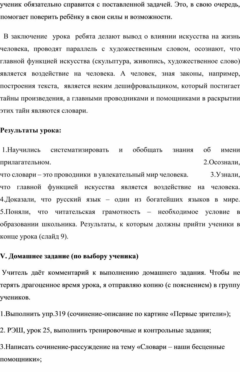 В заключение урока ребята делают вывод о влиянии искусства на жизнь человека, проводят параллель с художественным словом, осознают, что главной функцией искусства (скульптура, живопись, художественное слово) является воздействие на человека. А человек, зная законы, например, построения текста, является неким дешифровальщиком, который постигает тайны произведения, а главными проводниками и помощниками в раскрытии этих тайн являются словари.