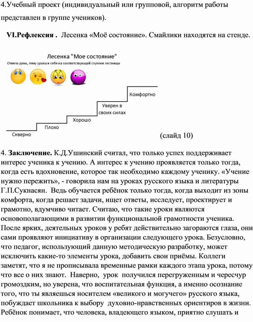 4. Заключение. К.Д.Ушинский считал, что только успех поддерживает интерес ученика к учению. А интерес к учению проявляется только тогда, когда есть вдохновение, которое так необходимо каждому ученику. «Учение нужно пережить», - говорила нам на уроках русского языка и литературы Г.П.Сукнасян. Ведь обучается ребёнок только тогда, когда выходит из зоны комфорта, когда решает задачи, ищет ответы, исследует, проектирует и грамотно, вдумчиво читает. Считаю, что такие уроки являются основополагающими в развитии функциональной грамотности ученика. После ярких, деятельных уроков у ребят действительно загораются глаза, они сами проявляют инициативу в организации следующего урока. Безусловно, что педагог, использующий данную методическую разработку, может исключить какие-то элементы урока, добавить свои приёмы. Коллеги заметят, что я не прописывала временные рамки каждого этапа урока, потому что все о них знают. Наверно, урок получился перегруженным и чересчур громоздким, но уверена, что воспитательная функция, а именно осознание того, что ты являешься носителем «великого и могучего» русского языка, побуждает школьника к выбору духовно-нравственных ориентиров в жизни. Ребёнок понимает, что человека, владеющего языком, приятно слушать и что, столкнувшись с новым «словом», появляется необходимость в его изучении. И, безусловно, ведущую роль в становлении личности ребёнка, раскрытии его потенциала, его самобытности играет именно учитель, наставник и помощник, защитник его интересов.