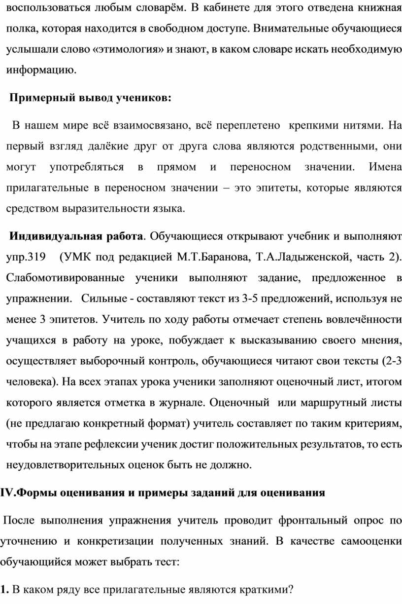 Индивидуальная работа. Обучающиеся открывают учебник и выполняют упр.319 (УМК под редакцией М.Т.Баранова, Т.А.Ладыженской, часть 2). Слабомотивированные ученики выполняют задание, предложенное в упражнении. Сильные - составляют текст из 3-5 предложений, используя не менее 3 эпитетов. Учитель по ходу работы отмечает степень вовлечённости учащихся в работу на уроке, побуждает к высказыванию своего мнения, осуществляет выборочный контроль, обучающиеся читают свои тексты (2-3 человека). На всех этапах урока ученики заполняют оценочный лист, итогом которого является отметка в журнале. Оценочный или маршрутный листы (не предлагаю конкретный формат) учитель составляет по таким критериям, чтобы на этапе рефлексии ученик достиг положительных результатов, то есть неудовлетворительных оценок быть не должно.