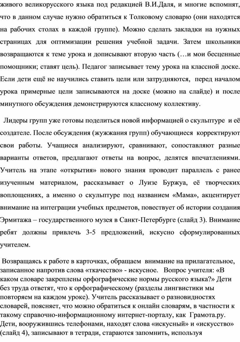 Лидеры групп уже готовы поделиться новой информацией о скульптуре и её создателе. После обсуждения (жужжания групп) обучающиеся корректируют свои работы. Учащиеся анализируют, сравнивают, сопоставляют разные варианты ответов, предлагают ответы на вопрос, делятся впечатлениями. Учитель на этапе «открытия» нового знания проводит параллель с ранее изученным материалом, рассказывает о Луизе Буржуа, её творческих воплощениях, а именно о скульптуре под названием «Мама», акцентирует внимание на интеграции учебных предметов, повествует об истории создания Эрмитажа – государственного музея в Санкт-Петербурге (слайд 3). Внимание ребят должны привлечь 3-5 предложений, искусно сформулированных учителем.