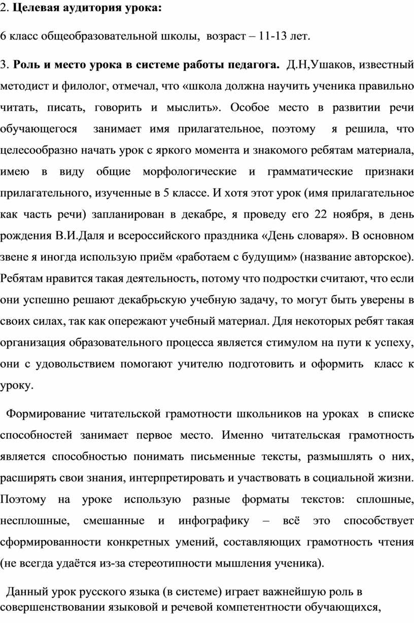 3. Роль и место урока в системе работы педагога. Д.Н,Ушаков, известный методист и филолог, отмечал, что «школа должна научить ученика правильно читать, писать, говорить и мыслить». Особое место в развитии речи обучающегося занимает имя прилагательное, поэтому я решила, что целесообразно начать урок с яркого момента и знакомого ребятам материала, имею в виду общие морфологические и грамматические признаки прилагательного, изученные в 5 классе. И хотя этот урок (имя прилагательное как часть речи) запланирован в декабре, я проведу его 22 ноября, в день рождения В.И.Даля и всероссийского праздника «День словаря». В основном звене я иногда использую приём «работаем с будущим» (название авторское). Ребятам нравится такая деятельность, потому что подростки считают, что если они успешно решают декабрьскую учебную задачу, то могут быть уверены в своих силах, так как опережают учебный материал. Для некоторых ребят такая организация образовательного процесса является стимулом на пути к успеху, они с удовольствием помогают учителю подготовить и оформить класс к уроку.