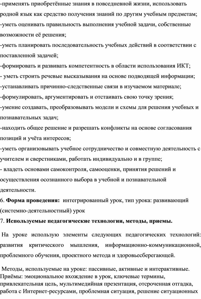 6. Форма проведения: интегрированный урок, тип урока: развивающий