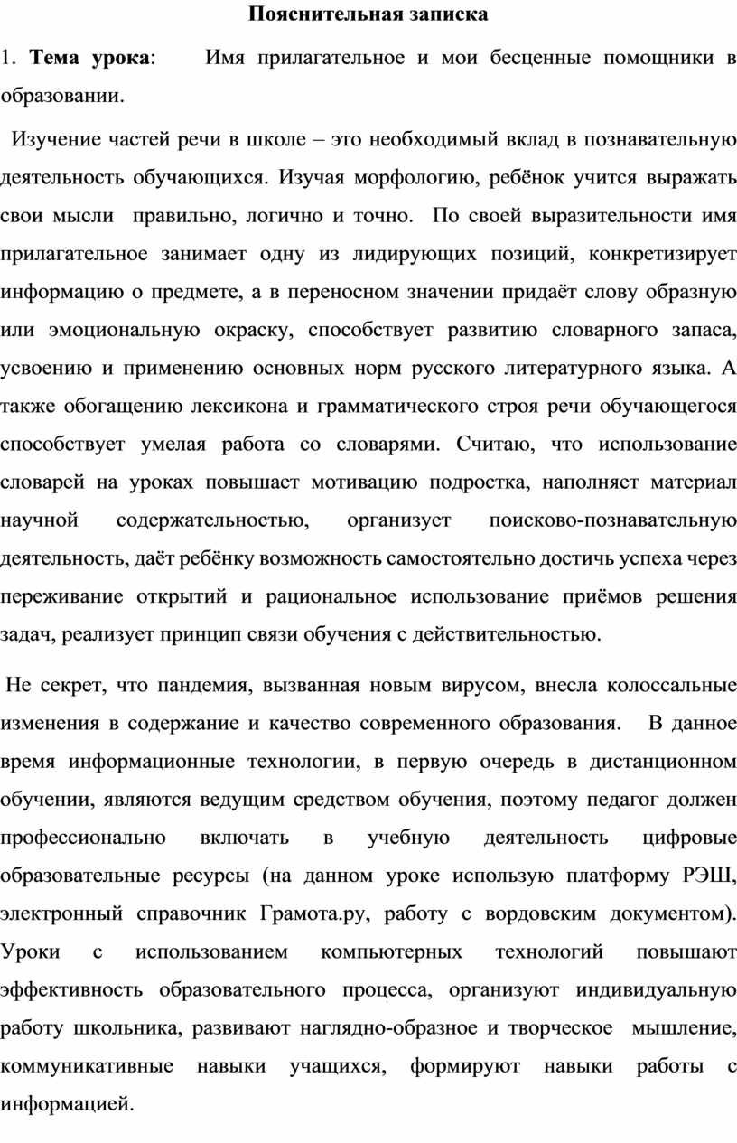 Не секрет, что пандемия, вызванная новым вирусом, внесла колоссальные изменения в содержание и качество современного образования. В данное время информационные технологии, в первую очередь в дистанционном обучении, являются ведущим средством обучения, поэтому педагог должен профессионально включать в учебную деятельность цифровые образовательные ресурсы (на данном уроке использую платформу РЭШ, электронный справочник Грамота.ру, работу с вордовским документом). Уроки с использованием компьютерных технологий повышают эффективность образовательного процесса, организуют индивидуальную работу школьника, развивают наглядно-образное и творческое мышление, коммуникативные навыки учащихся, формируют навыки работы с информацией.