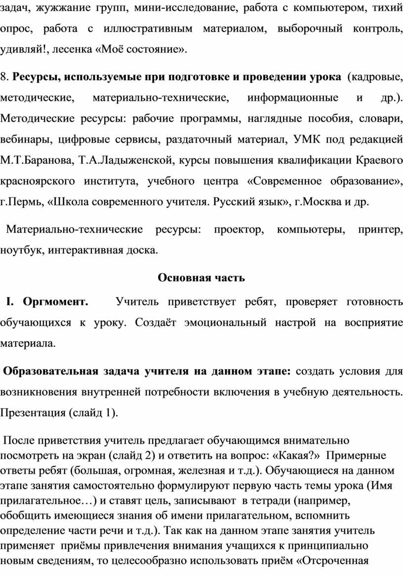 8. Ресурсы, используемые при подготовке и проведении урока (кадровые, методические, материально-технические, информационные и др.). Методические ресурсы: рабочие программы, наглядные пособия, словари, вебинары, цифровые сервисы, раздаточный материал, УМК под редакцией М.Т.Баранова, Т.А.Ладыженской, курсы повышения квалификации Краевого красноярского института, учебного центра «Современное образование», г.Пермь, «Школа современного учителя. Русский язык», г.Москва и др.