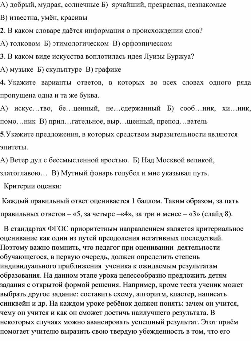 Каждый правильный ответ оценивается 1 баллом. Таким образом, за пять правильных ответов – «5, за четыре –«4», за три и менее – «3» (слайд 8).