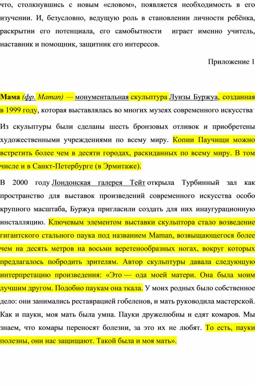 Учитель предлагает учащимся разделиться на группы. В данном классе отработана групповая форма организации учебного занятия, то есть дети (по условному сигналу, у нас это поднятая вверх правая или левая рука) знают, когда и в какой группе они сегодня работают, то есть группе сменного или постоянного состава. На данном этапе ребята в течение минуты занимают свои места и выполняют задания в карточках. Учитель акцентирует внимание ребят на том, что для решения образовательной задачи нужно вновь обратиться к изображению паучихи. Лидеры групп получают задание и занимают места за компьютером. На рабочем столе ребята находят документ под названием «Луиза Буржуа», читают текст и выделяют жёлтым цветом главную информацию, распечатывают файл и возвращаются в свою группу (приложение 1). Остальные обучающиеся работают в группах (составляют словосочетания).