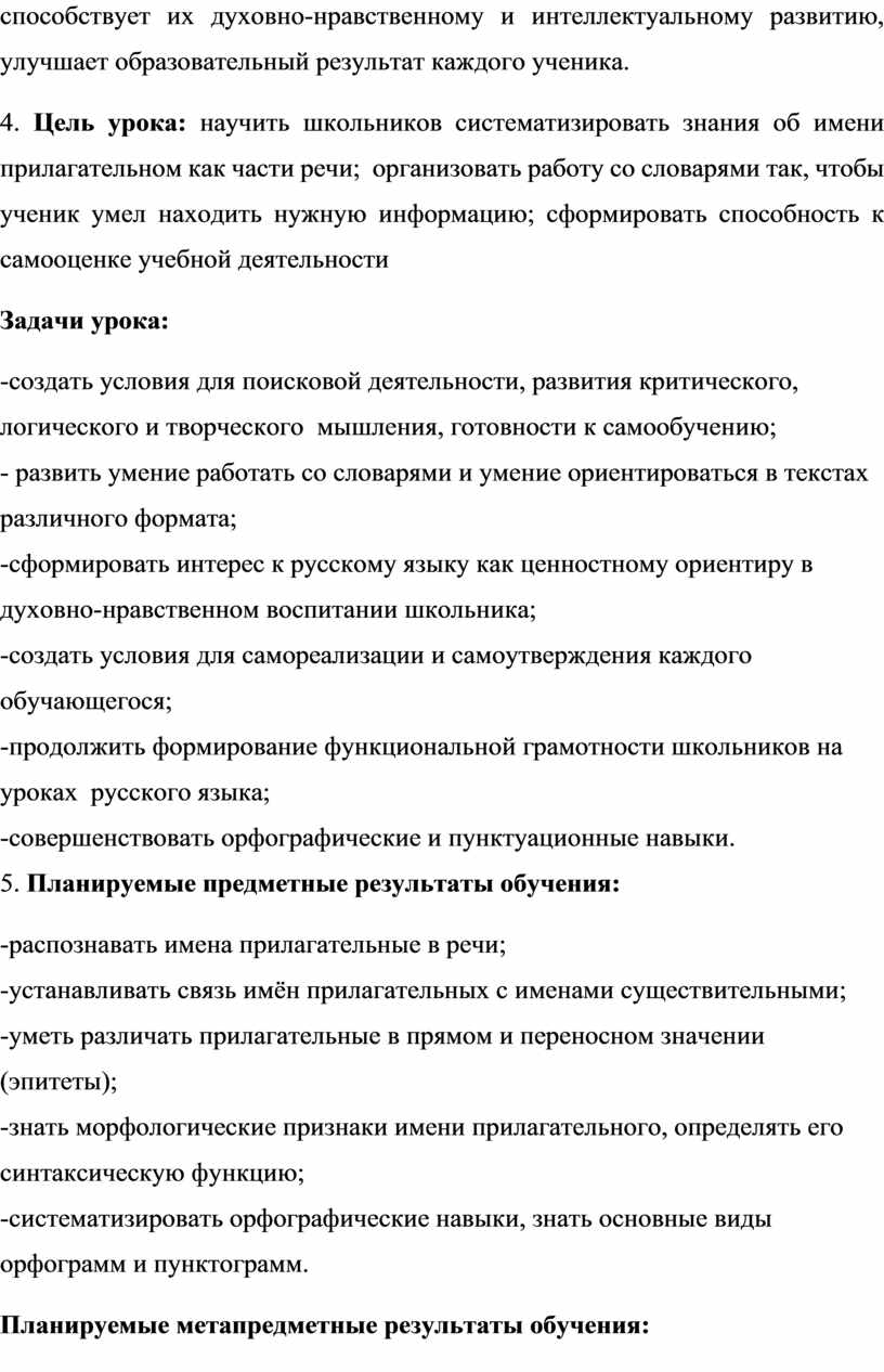 -распознавать имена прилагательные в речи; -устанавливать связь имён прилагательных с именами существительными; -уметь различать прилагательные в прямом и переносном значении (эпитеты); -знать морфологические признаки имени прилагательного, определять его синтаксическую функцию; -систематизировать орфографические навыки, знать основные виды орфограмм и пунктограмм.