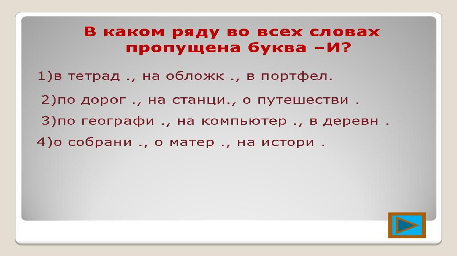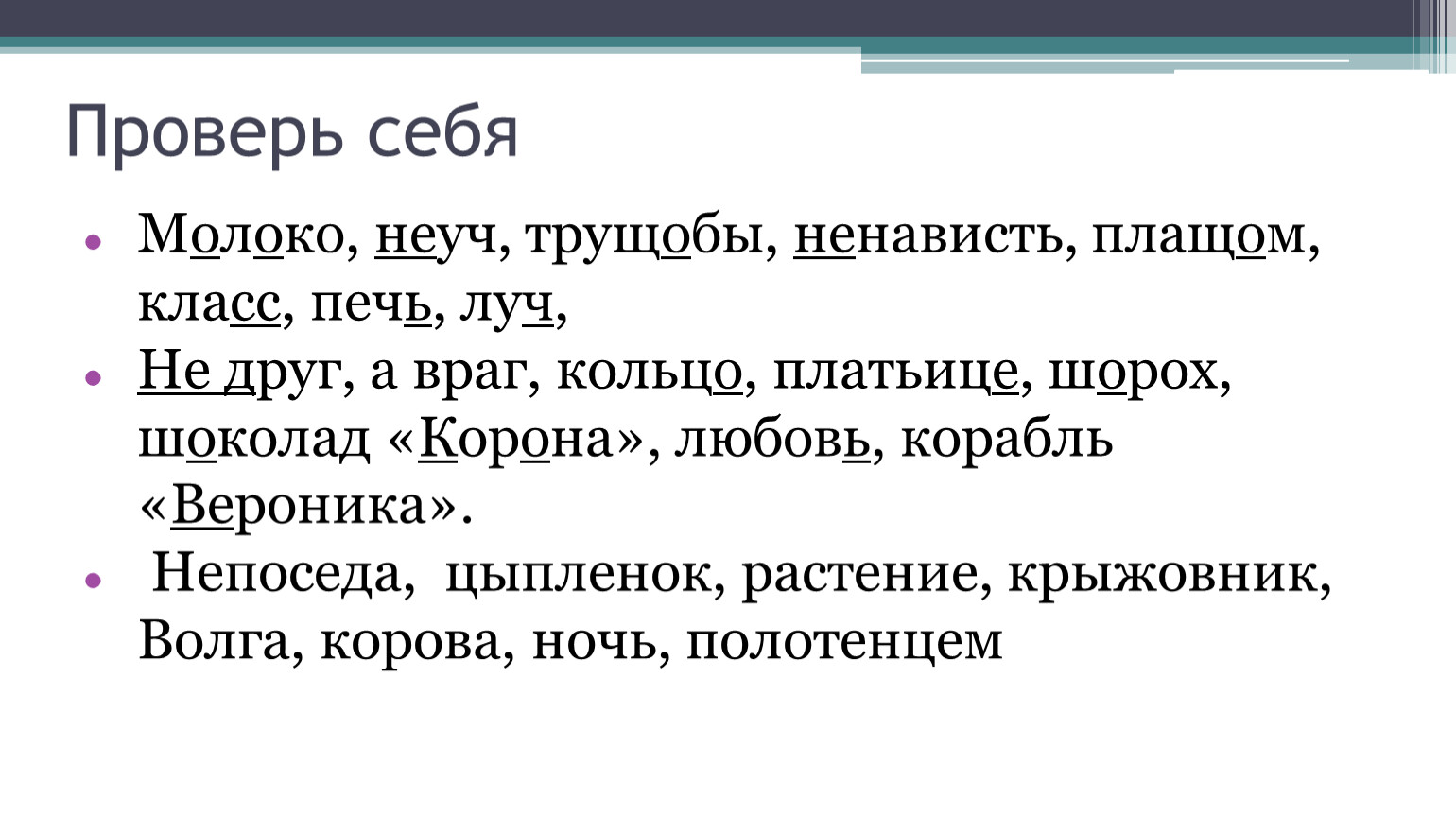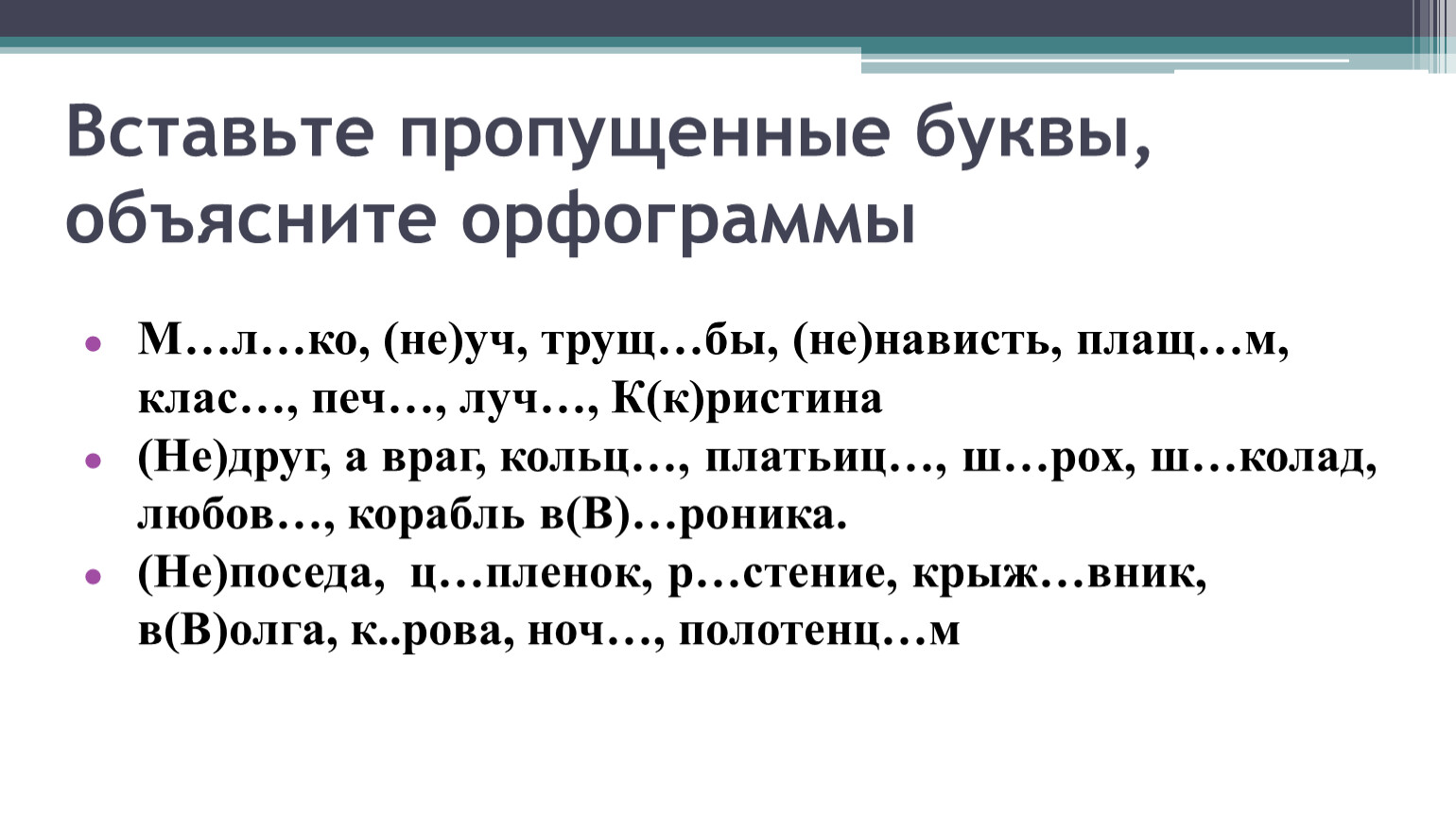 М…л…ко, (не)уч, трущ…бы, (не)нависть, плащ…м, клас…, печ…, луч…, К(к)ристина
