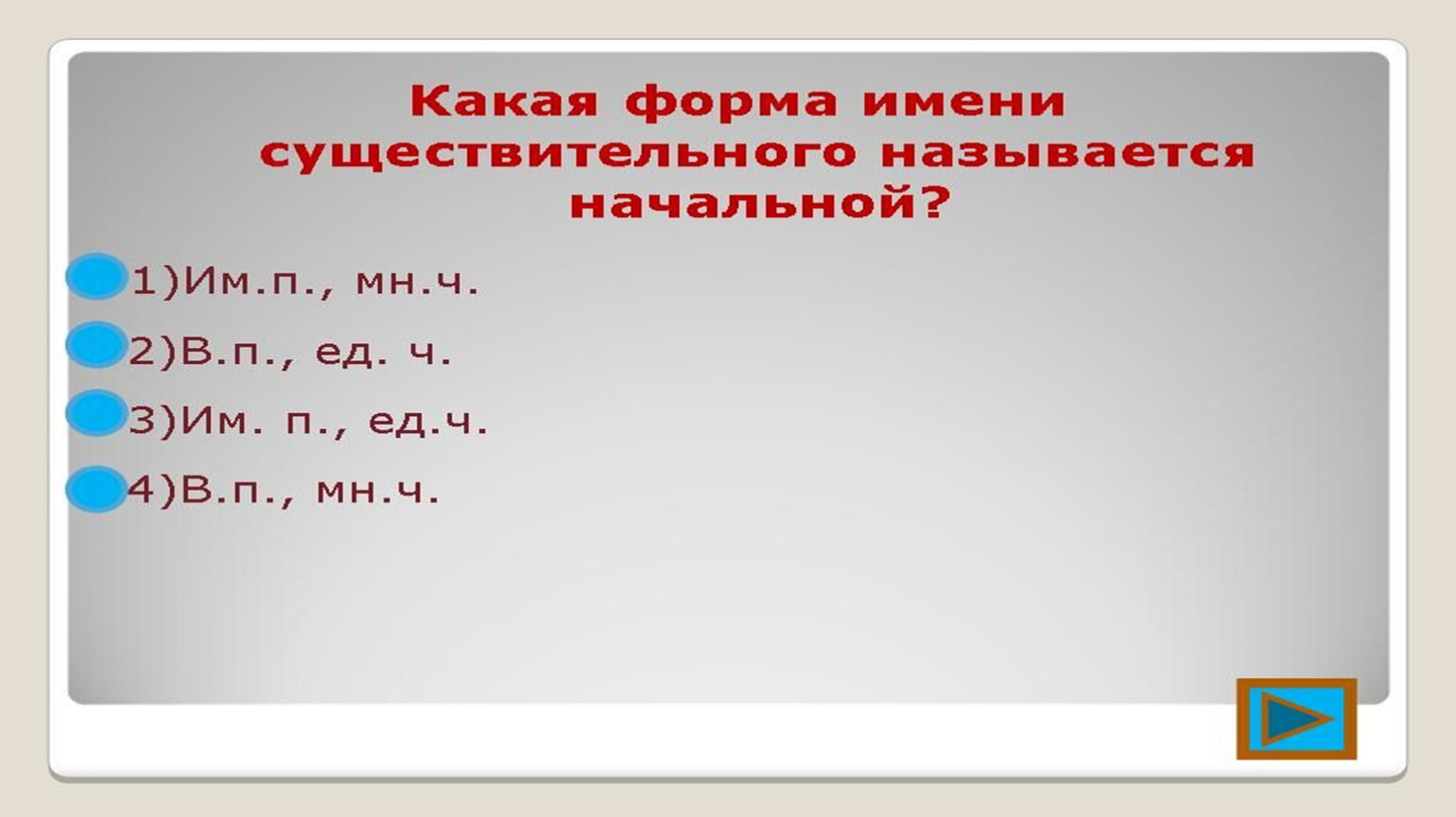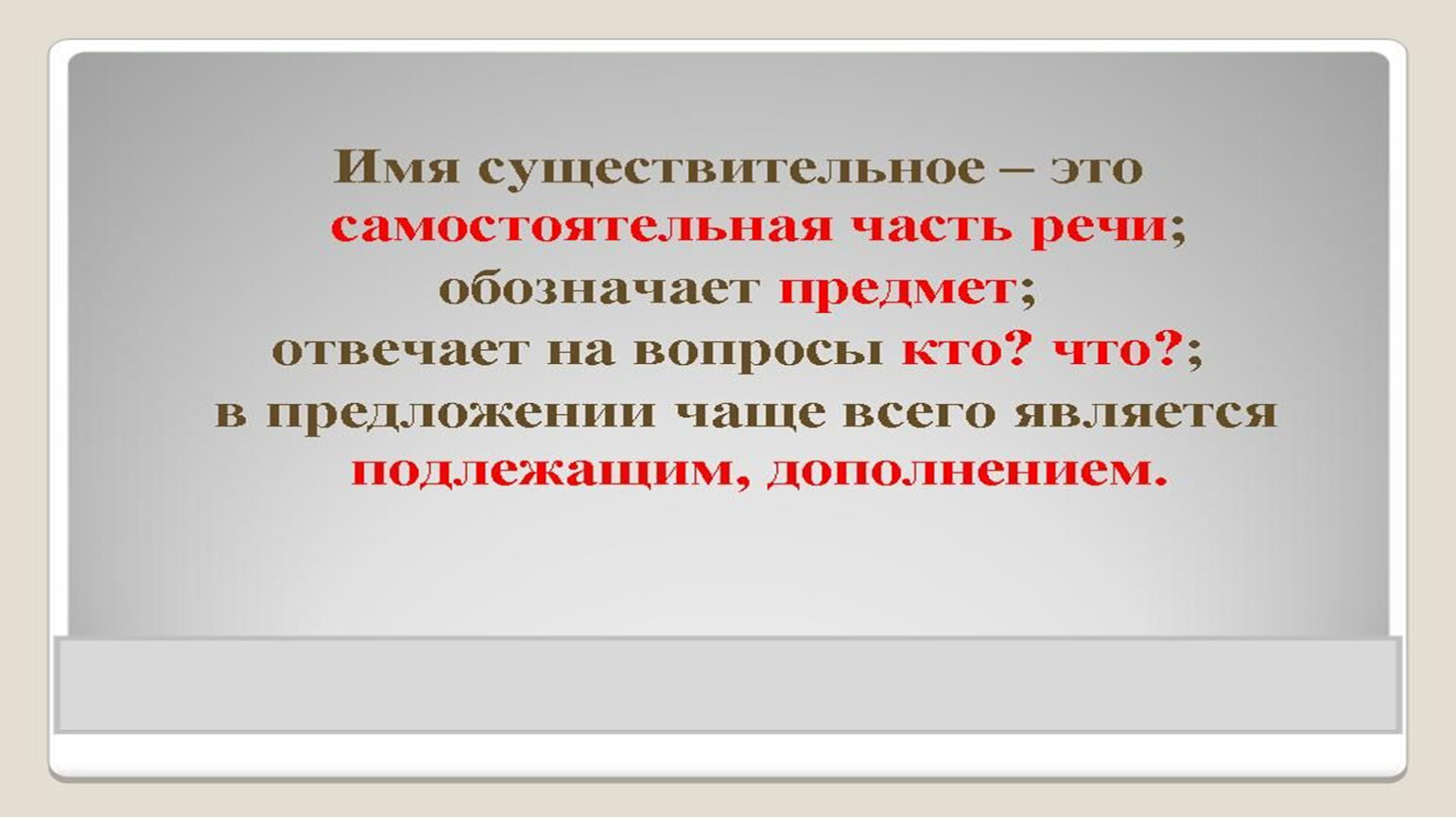 Имя существительное – это служебная часть речи, которая обозначает признак предмета и отвечает на вопрос кто? что?