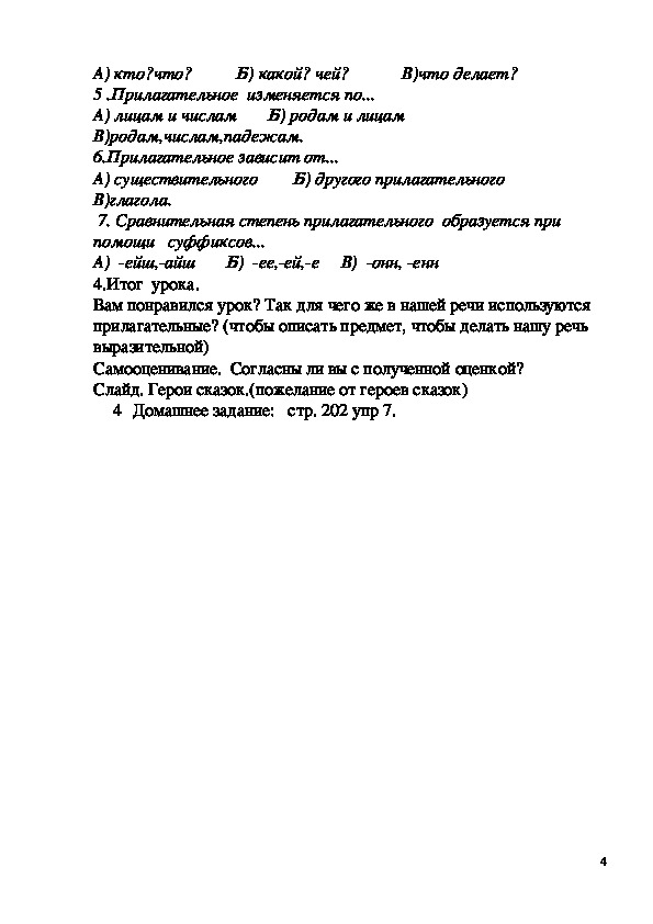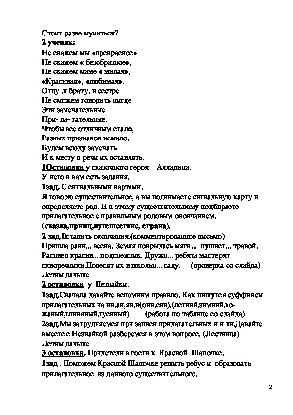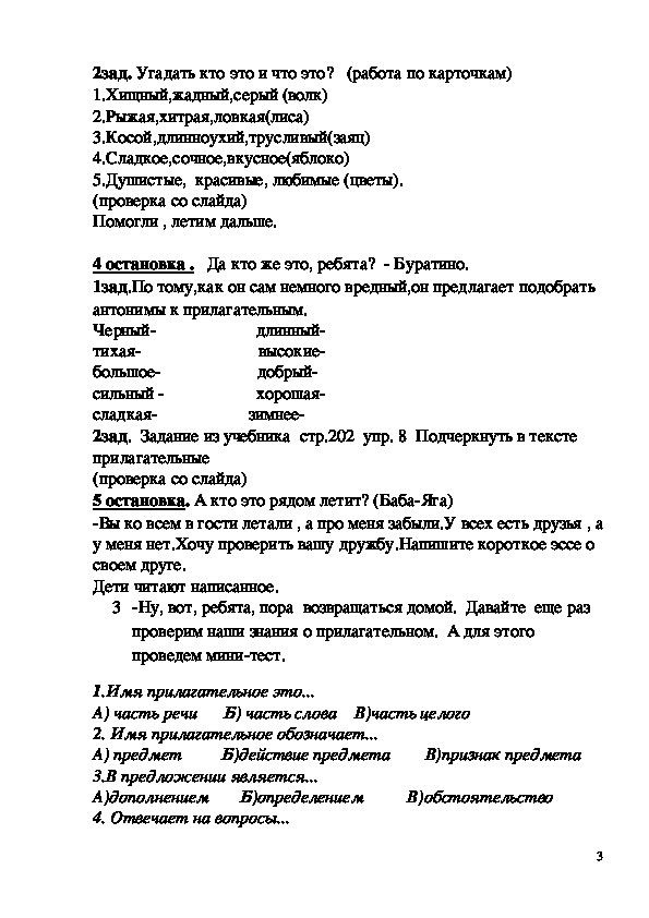Цели: Закрепить и обобщить знания детей по теме: «Имя прилагательное», пополнение словарного запаса, способствовать развитию мышления, памяти, речи, внимания, умения анализировать и обобщать; Развитие знаний умений и навыков; Воспитание любви к сказкам,интерес к предмету.