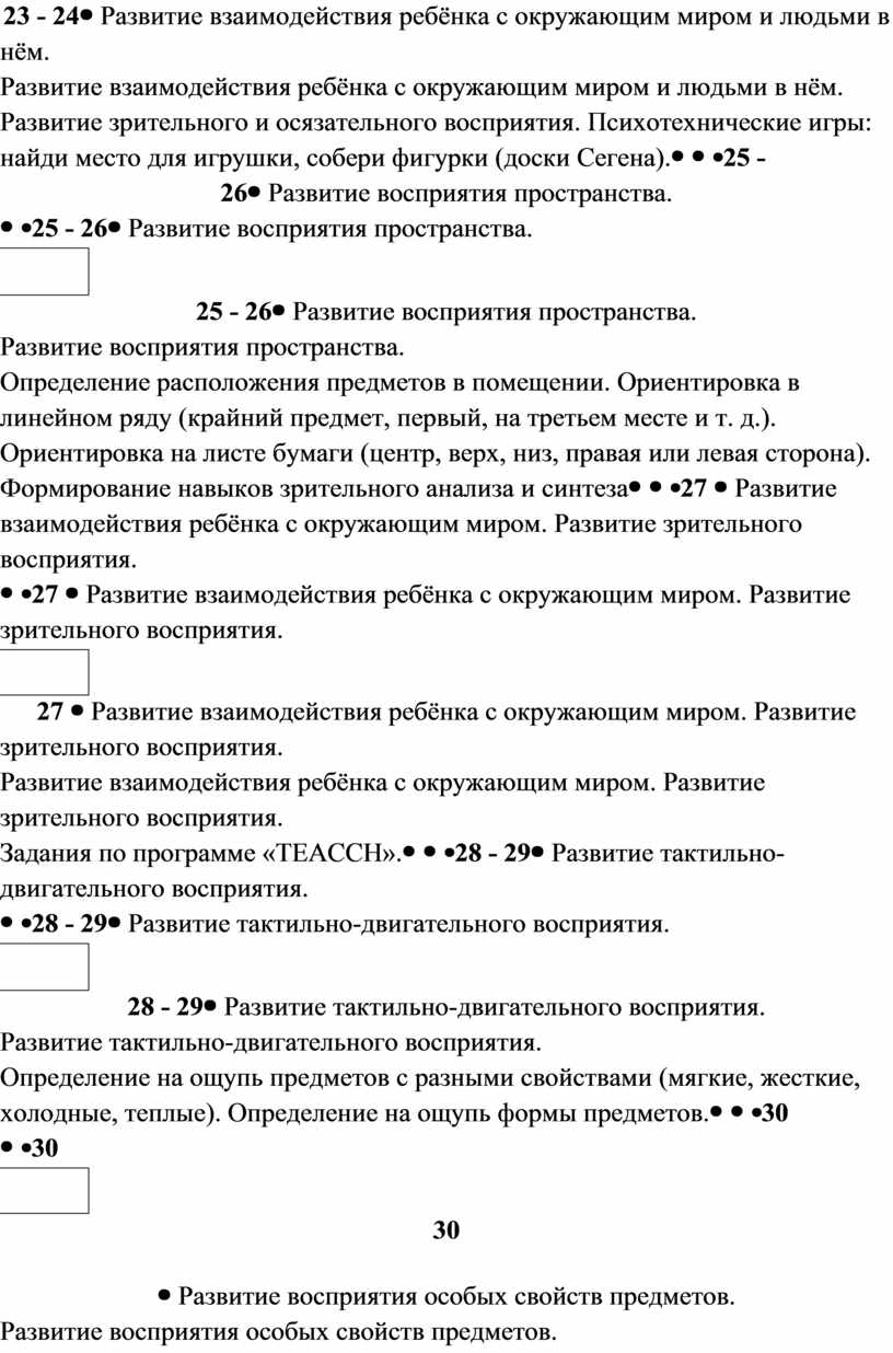 Развитие восприятия пространства. Определение расположения предметов в помещении. Ориентировка в линейном ряду (крайний предмет, первый, на третьем месте и т. д.). Ориентировка на листе бумаги (центр, верх, низ, правая или левая сторона). Формирование навыков зрительного анализа и синтеза |