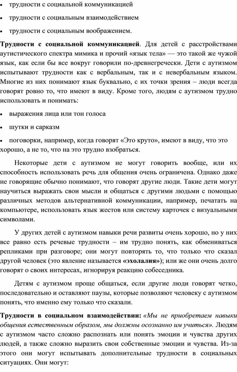 Трудности с социальной коммуникацией. Для детей с расстройствами аутистического спектра мимика и прочий «язык тела» — это такой же чужой язык, как если бы все вокруг говорили по-древнегречески. Дети с аутизмом испытывают трудности как с вербальным, так и с невербальным языком. Многие из них понимают язык буквально, с их точки зрения – люди всегда говорят ровно то, что имеют в виду. Кроме того, людям с аутизмом трудно использовать и понимать: