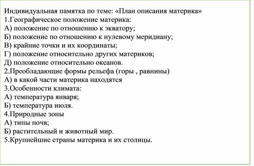 Индивидуальная памятка по теме: «План описания материка»