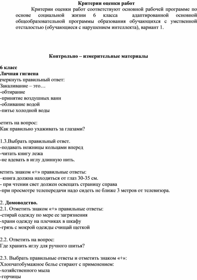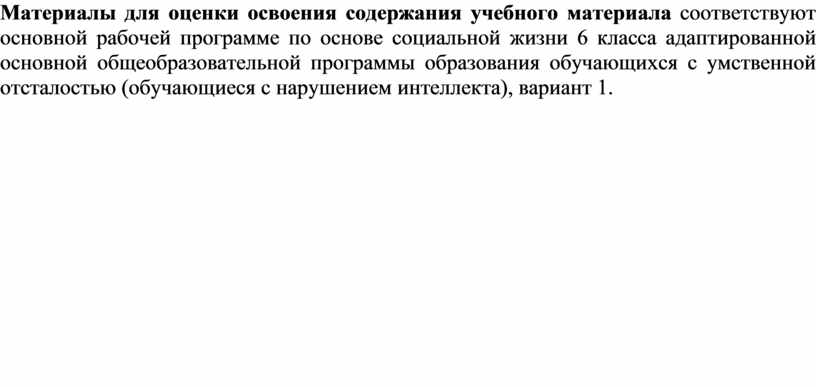 Материалы для оценки освоения содержания учебного материала соответствуют основной рабочей программе по основе социальной жизни 6 класса адаптированной основной общеобразовательной программы образования обучающихся с умственной отсталостью (обучающиеся с нарушением интеллекта), вариант 1.