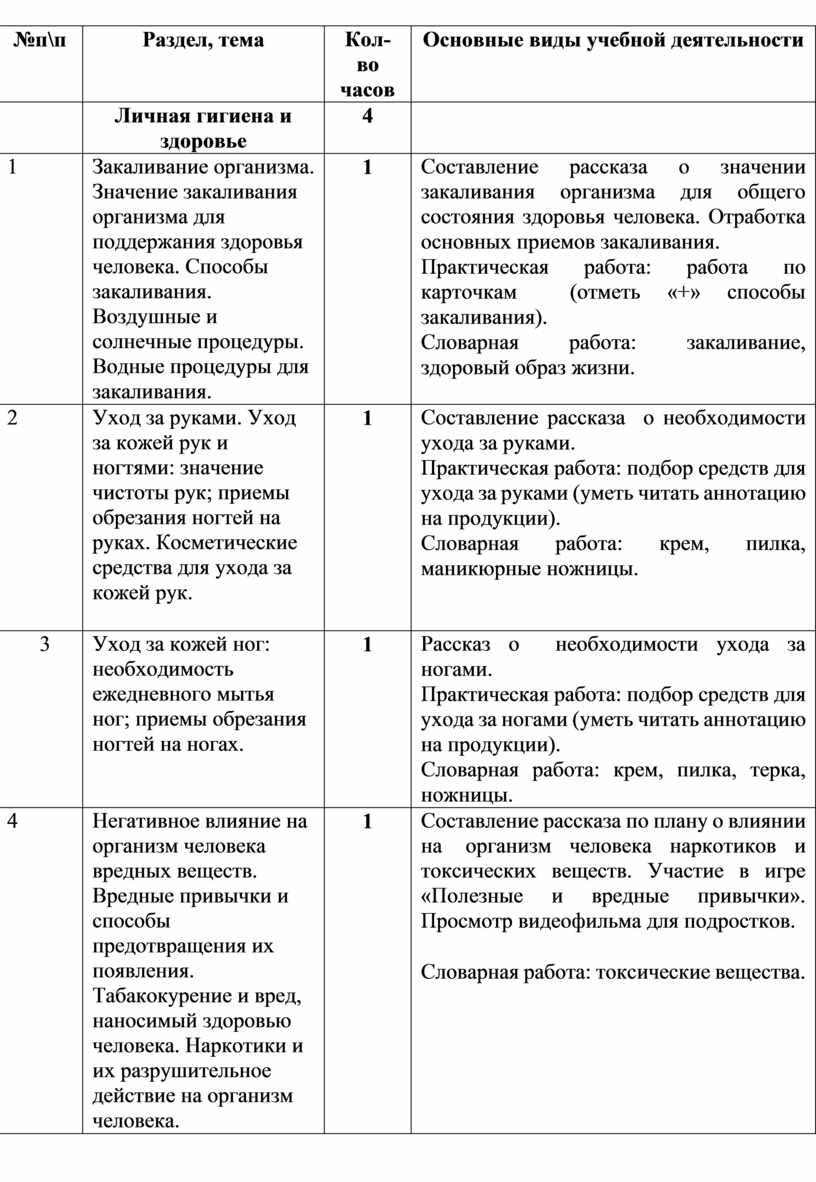 Личная гигиена и здоровье: Закаливание организма. Значение закаливания организма для поддержания здоровья человека. Способы закаливания. Воздушные и солнечные процедуры. Водные процедуры для закаливания. Уход за руками. Уход за кожей рук и ногтями: значение чистоты рук; приемы обрезания ногтей на руках. Косметические средства для ухода за кожей рук. Уход за кожей ног: необходимость ежедневного мытья ног; приемы обрезания ногтей на ногах. Негативное влияние на организм человека вредных веществ. Вредные привычки и способы предотвращения их появления. Табакокурение и вред, наносимый здоровью человека. Наркотики и их разрушительное действие на организм человека.