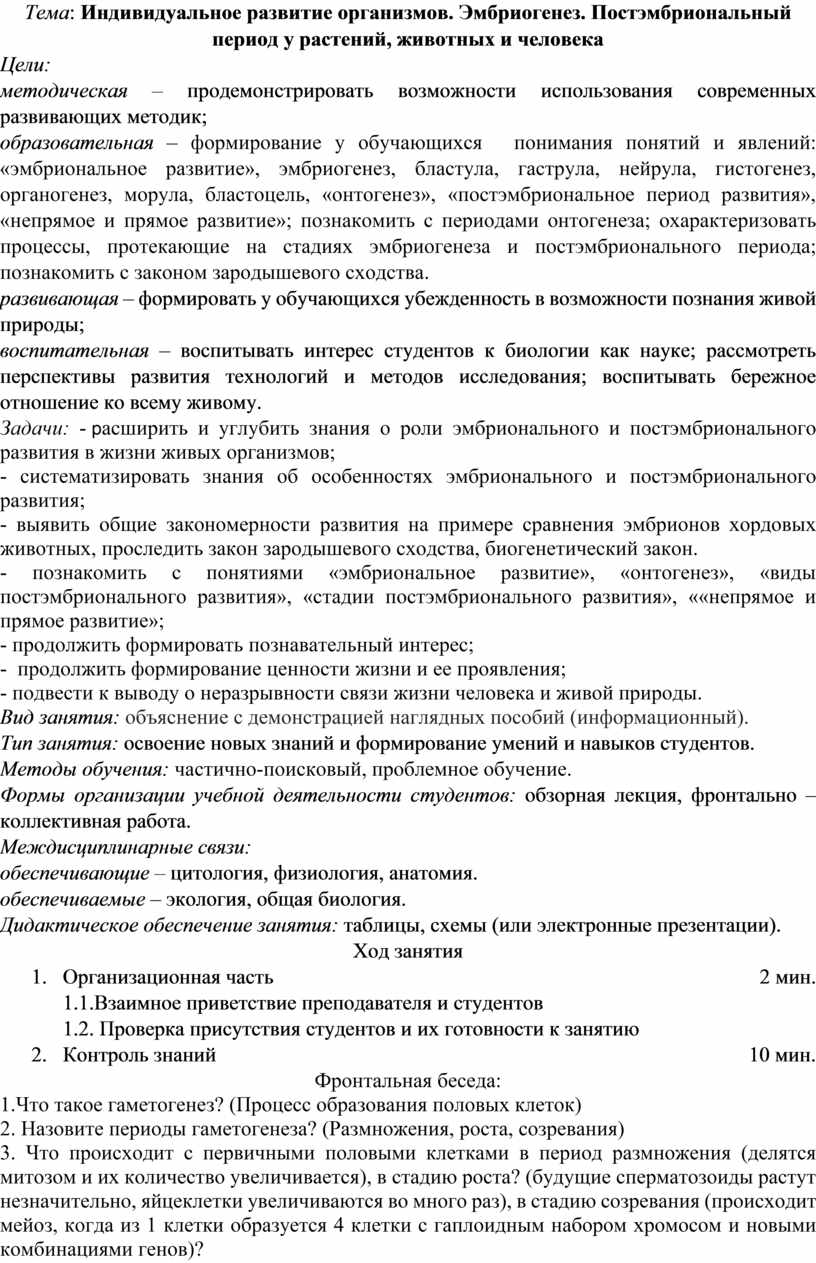 Тема: Индивидуальное развитие организмов. Эмбриогенез. Постэмбриональный период у растений, животных и человека