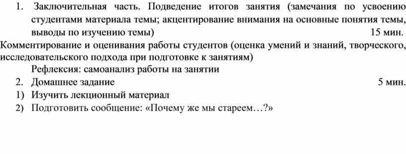 5. Заключительная часть. Подведение итогов занятия (замечания по усвоению студентами материала темы; акцентирование внимания на основные понятия темы, выводы по изучению темы) 15 мин.