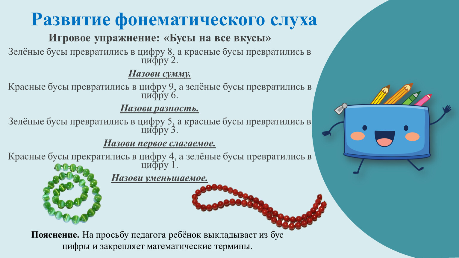 Пояснение. На просьбу педагога ребёнок выкладывает из бус цифры и закрепляет математические термины.