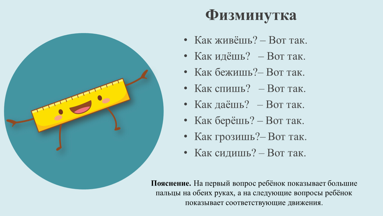 Пояснение. На первый вопрос ребёнок показывает большие пальцы на обеих руках, а на следующие вопросы ребёнок показывает соответствующие движения.