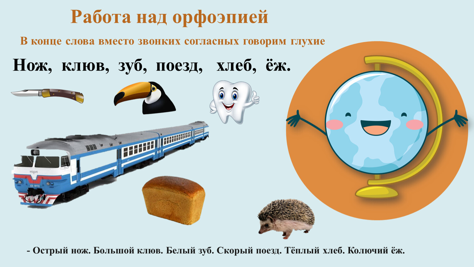 Нож, клюв, зуб, поезд, хлеб, ёж.