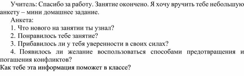 Учитель: Спасибо за работу. Занятие окончено. Я хочу вручить тебе небольшую анкету – мини домашнее задание.