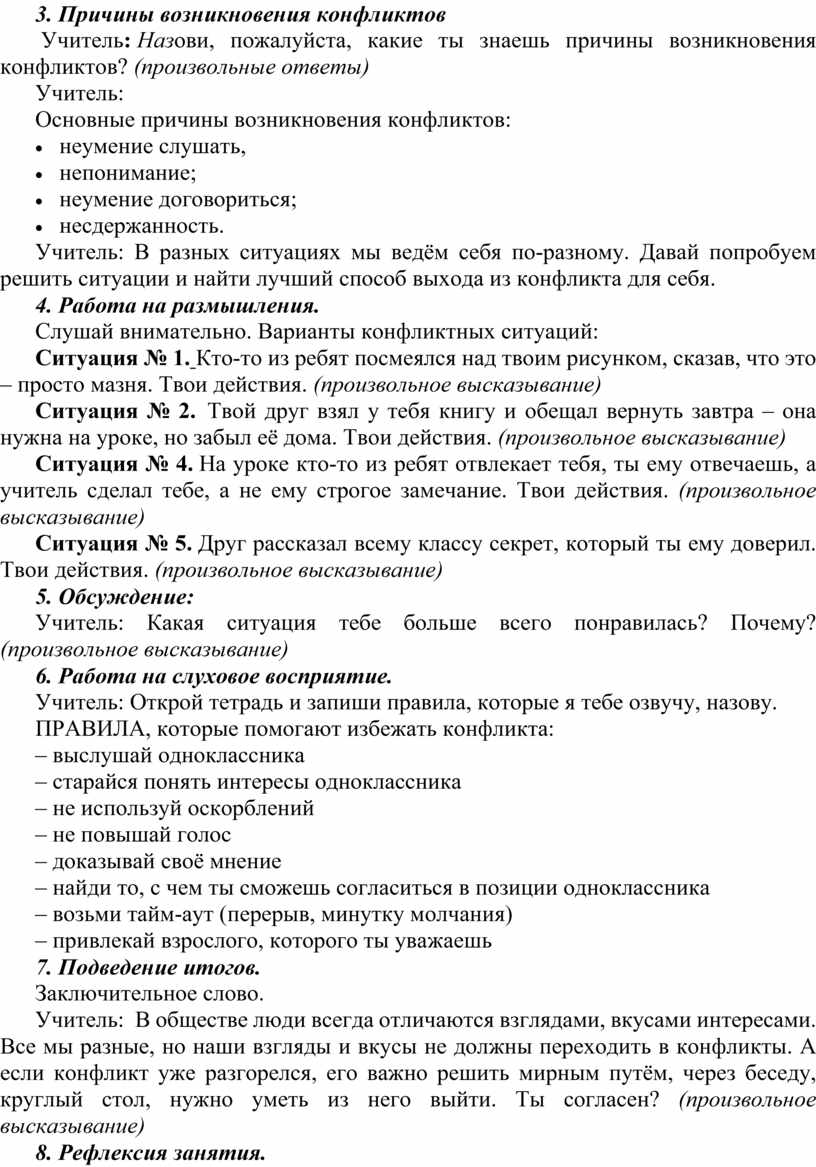 Учитель: Назови, пожалуйста, какие ты знаешь причины возникновения конфликтов? (произвольные ответы)