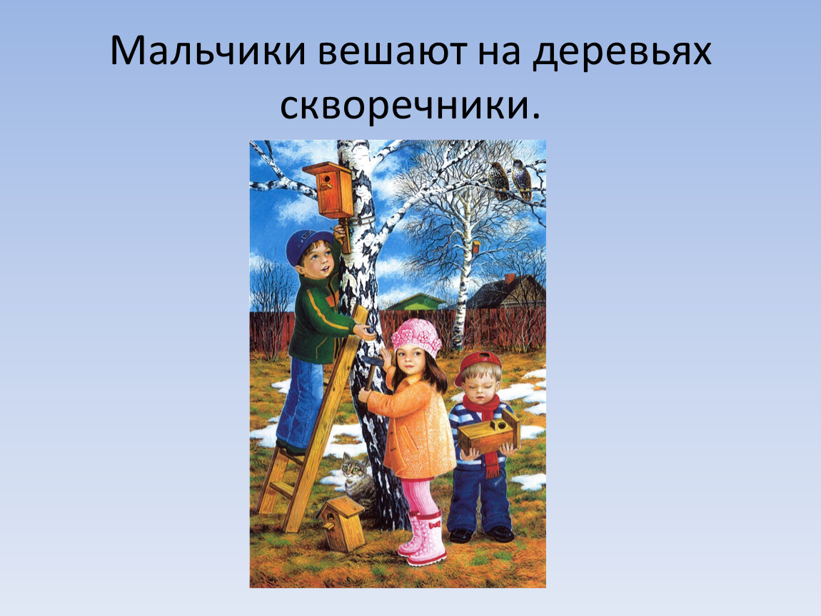 Мальчики вешают на деревьях скворечники.