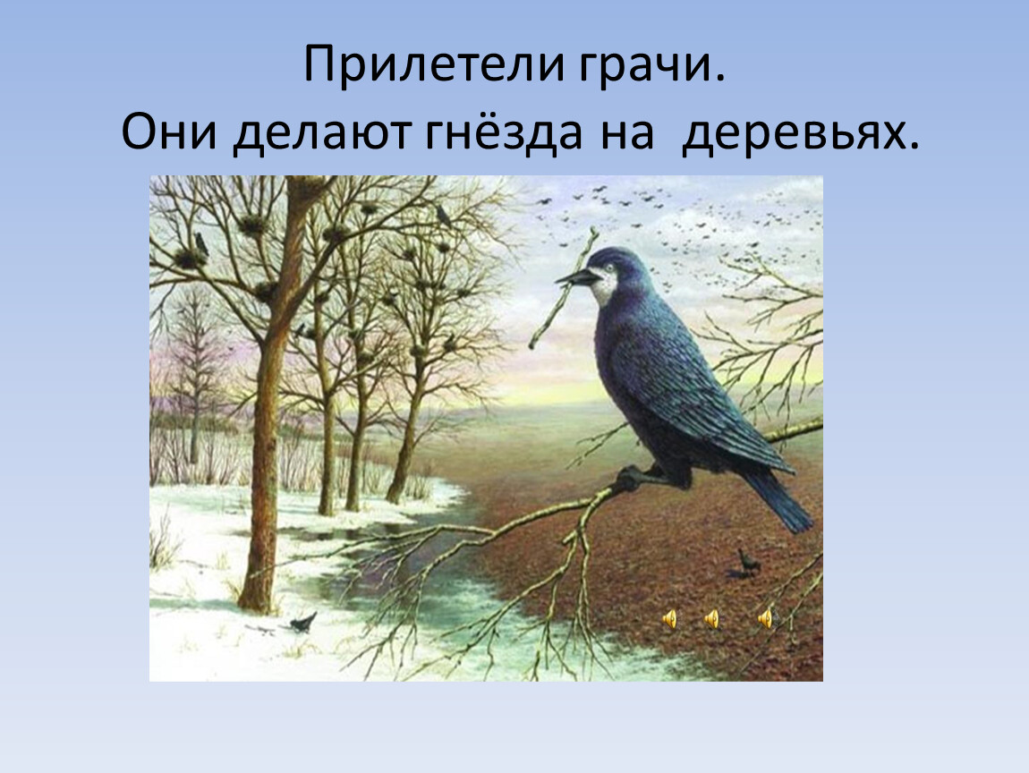 Прилетели грачи. Они делают гнёзда на деревьях.