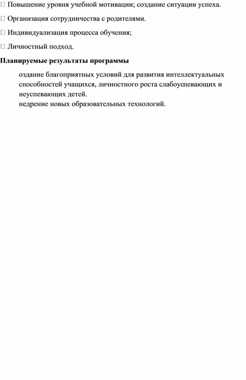 1. Создание благоприятных условий для развития интеллектуальных способностей учащихся, личностного роста слабоуспевающих и неуспевающих детей.