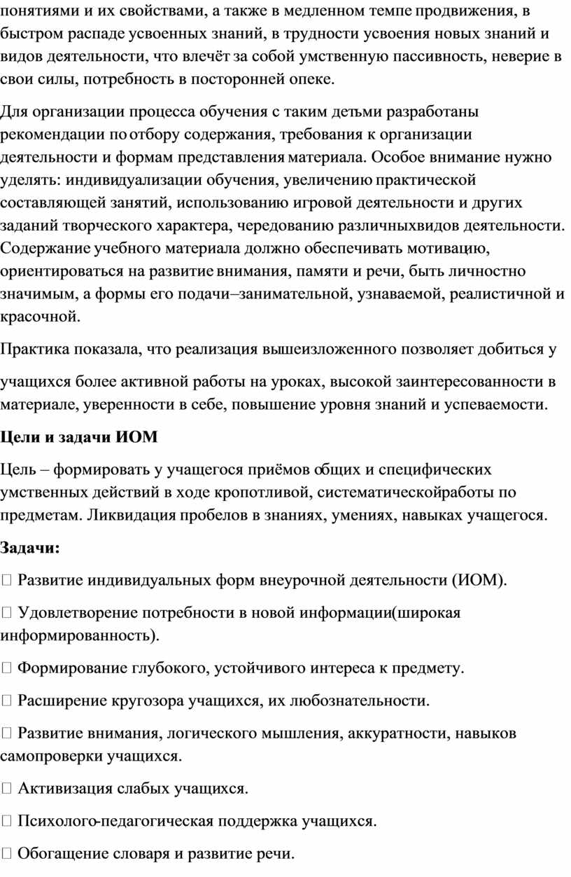 Цель – формировать у учащегося приёмов общих и специфических умственных действий в ходе кропотливой, систематической работы по предметам. Ликвидация пробелов в знаниях, умениях, навыках учащегося.