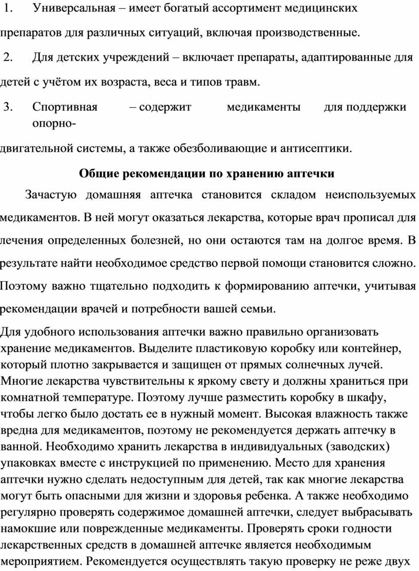 4. Универсальная – имеет богатый ассортимент медицинских препаратов для различных ситуаций, включая производственные.