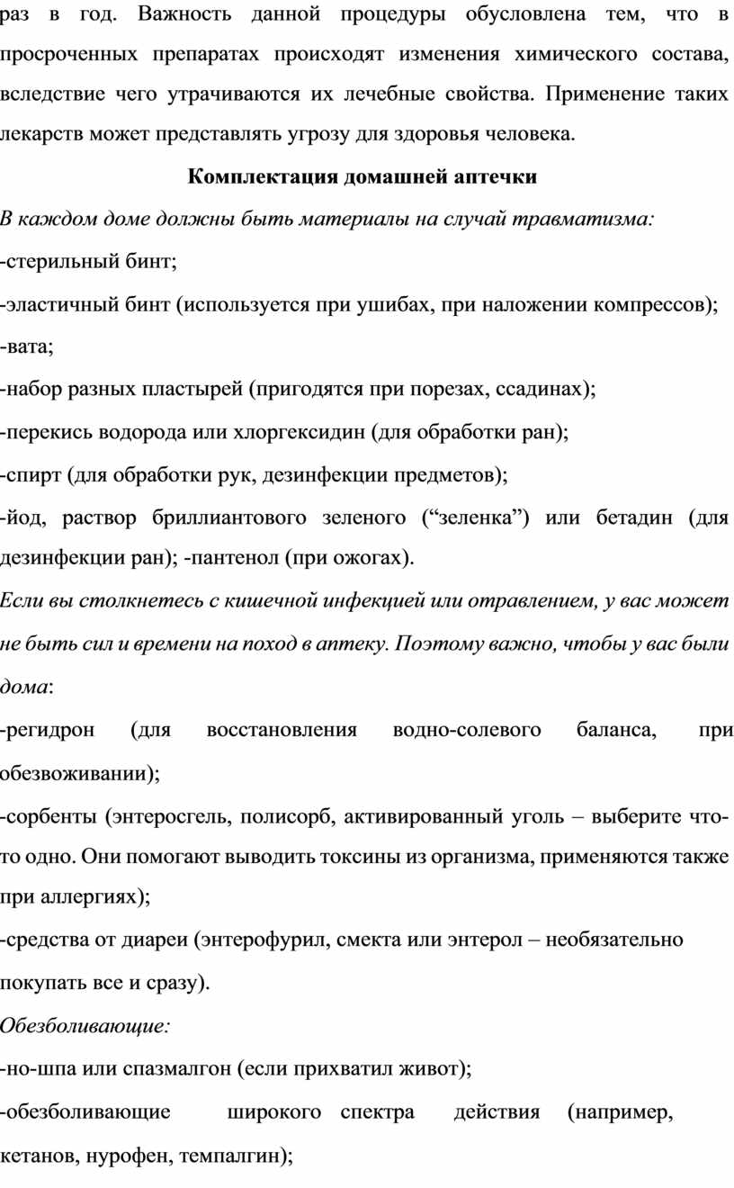 Цель: ознакомиться с содержимым и рекомендациями хранения медикаментов в домашней аптечке, а также аргументировать важность наличия аптечки в домашних условиях