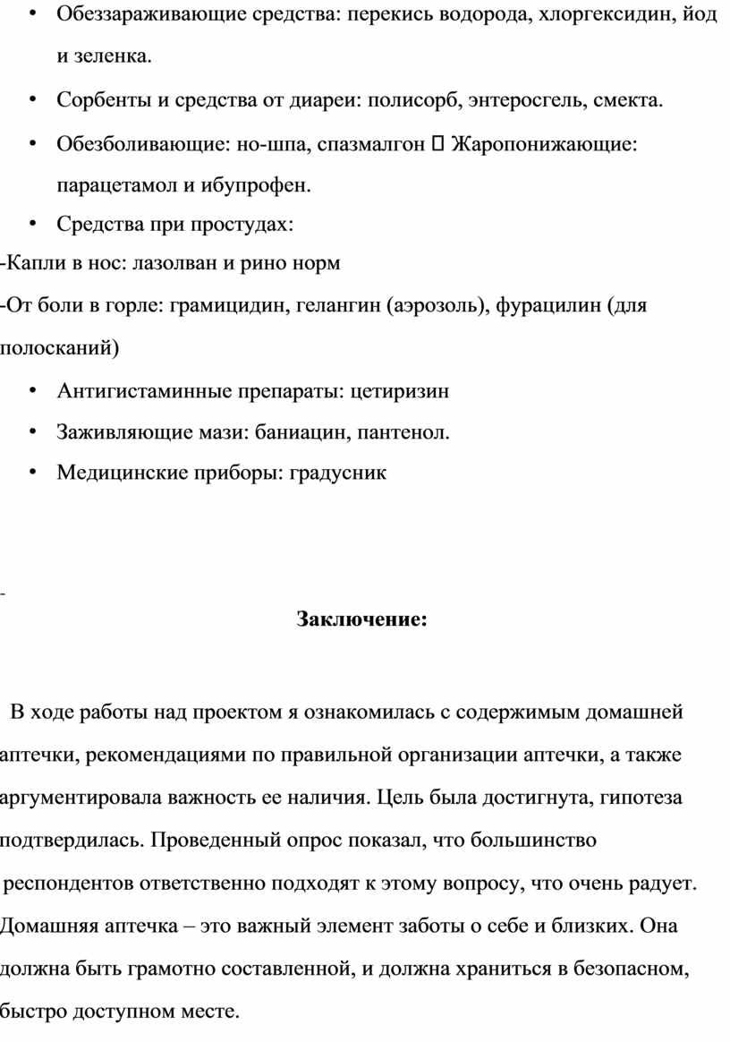 В ходе работы над проектом я ознакомилась с содержимым домашней аптечки, рекомендациями по правильной организации аптечки, а также аргументировала важность ее наличия. Цель была достигнута, гипотеза подтвердилась. Проведенный опрос показал, что большинство