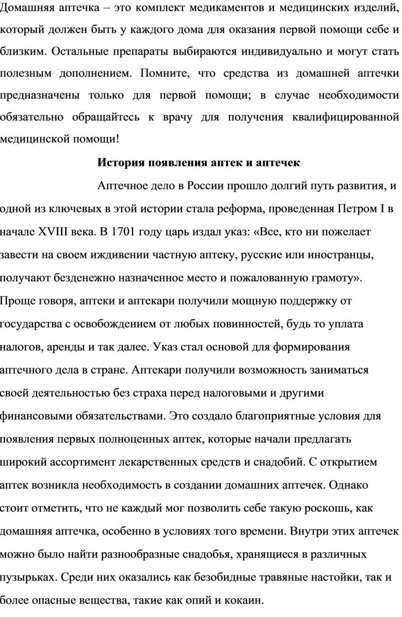Что такое домашняя аптечка? ............................................................. 4 История появления аптек и аптечек ................................................... 4