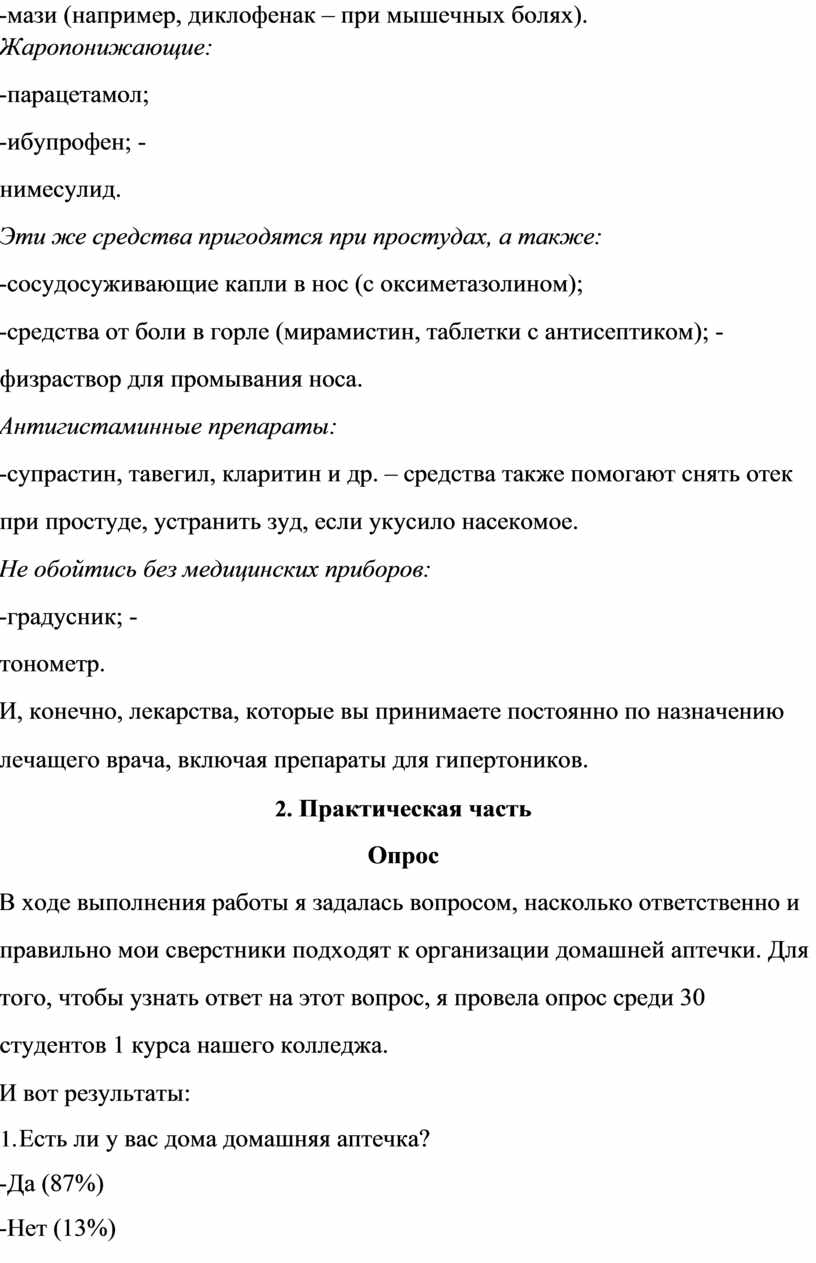В ходе выполнения работы я задалась вопросом, насколько ответственно и правильно мои сверстники подходят к организации домашней аптечки. Для того, чтобы узнать ответ на этот вопрос, я провела опрос среди 30 студентов 1 курса нашего колледжа.