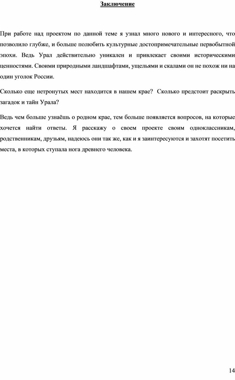 При работе над проектом по данной теме я узнал много нового и интересного, что позволило глубже, и больше полюбить культурные достопримечательные первобытной эпохи. Ведь Урал действительно уникален и привлекает своими историческими ценностями. Своими природными ландшафтами, ущельями и скалами он не похож ни на один уголок России.