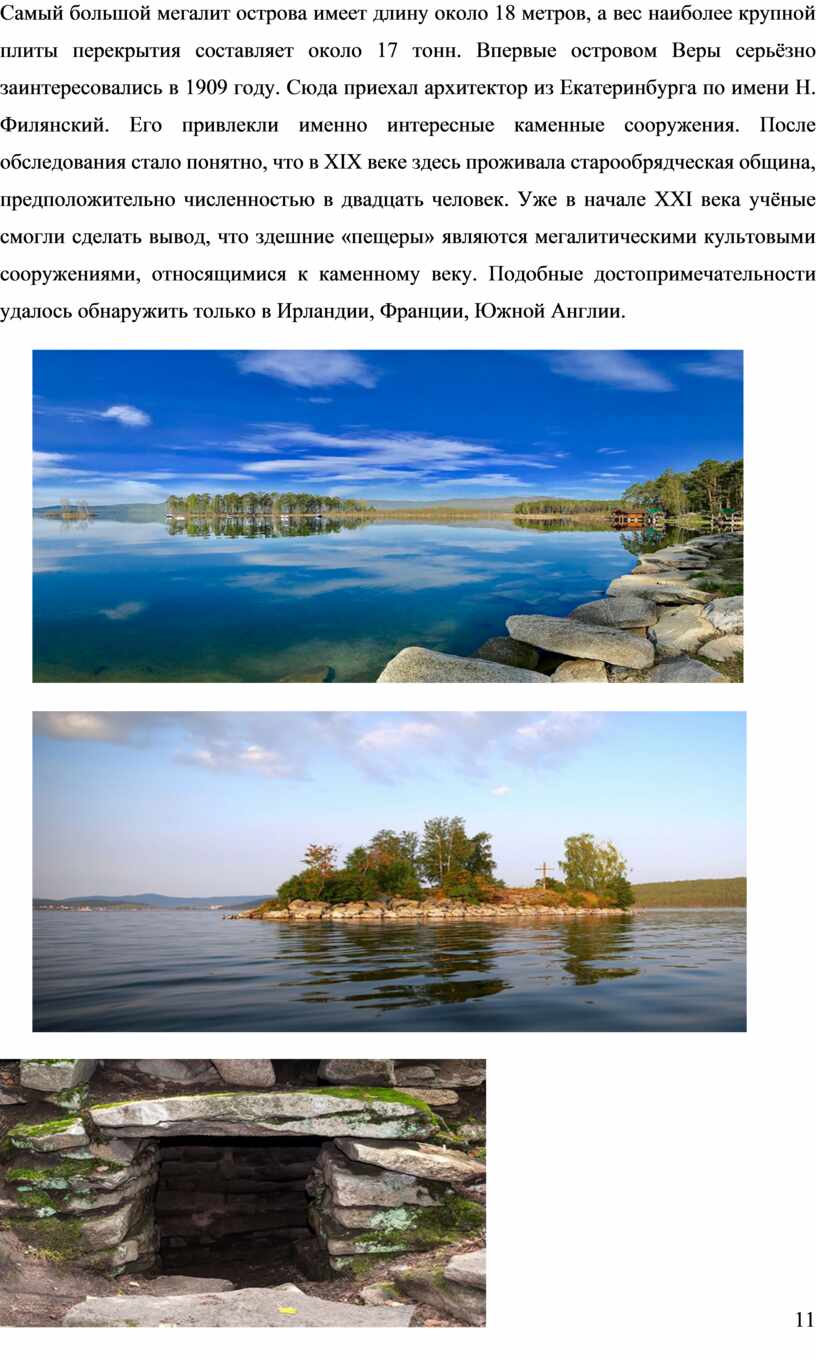 Самый большой мегалит острова имеет длину около 18 метров, а вес наиболее крупной плиты перекрытия составляет около 17 тонн. Впервые островом Веры серьёзно заинтересовались в 1909 году. Сюда приехал архитектор из Екатеринбурга по имени Н. Филянский. Его привлекли именно интересные каменные сооружения. После обследования стало понятно, что в XIX веке здесь проживала старообрядческая община, предположительно численностью в двадцать человек. Уже в начале XXI века учёные смогли сделать вывод, что здешние «пещеры» являются мегалитическими культовыми сооружениями, относящимися к каменному веку. Подобные достопримечательности удалось обнаружить только в Ирландии, Франции, Южной Англии.