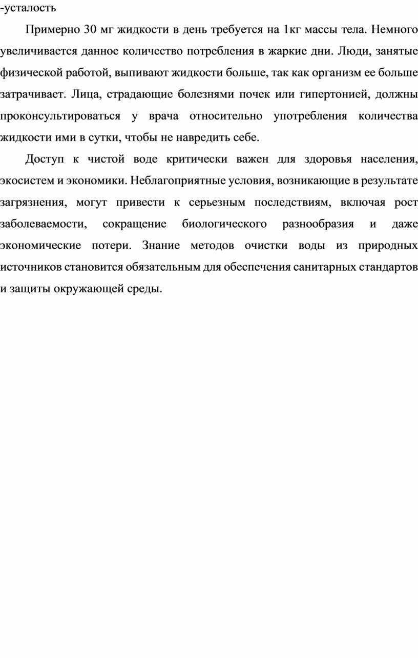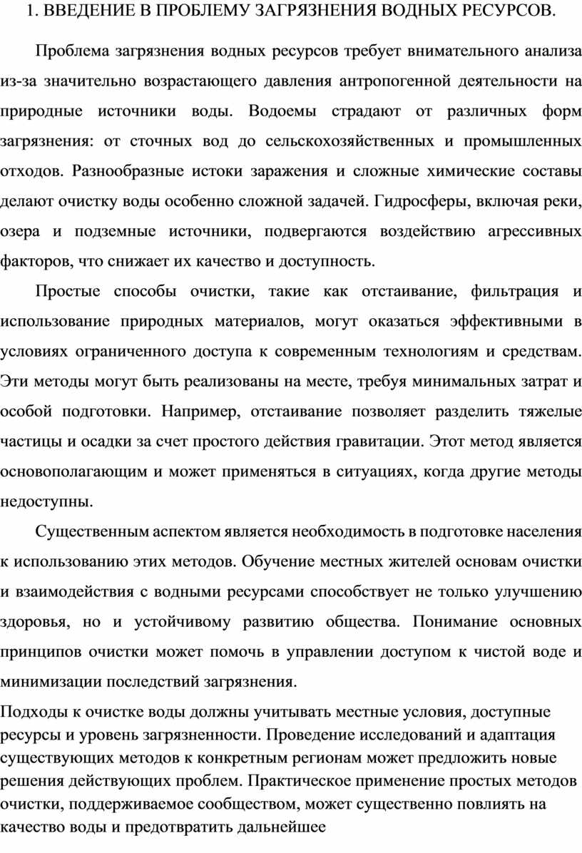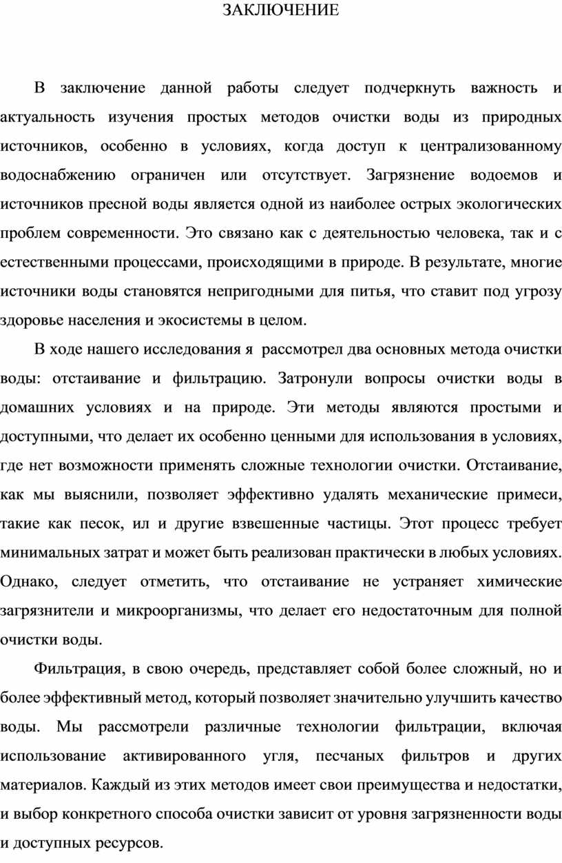В заключение данной работы следует подчеркнуть важность и актуальность изучения простых методов очистки воды из природных источников, особенно в условиях, когда доступ к централизованному водоснабжению ограничен или отсутствует. Загрязнение водоемов и источников пресной воды является одной из наиболее острых экологических проблем современности. Это связано как с деятельностью человека, так и с естественными процессами, происходящими в природе. В результате, многие источники воды становятся непригодными для питья, что ставит под угрозу здоровье населения и экосистемы в целом.