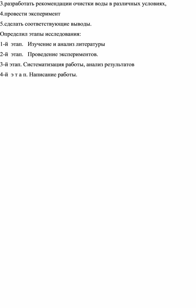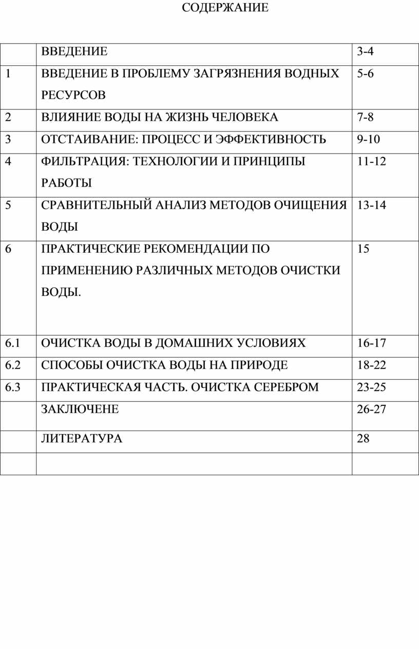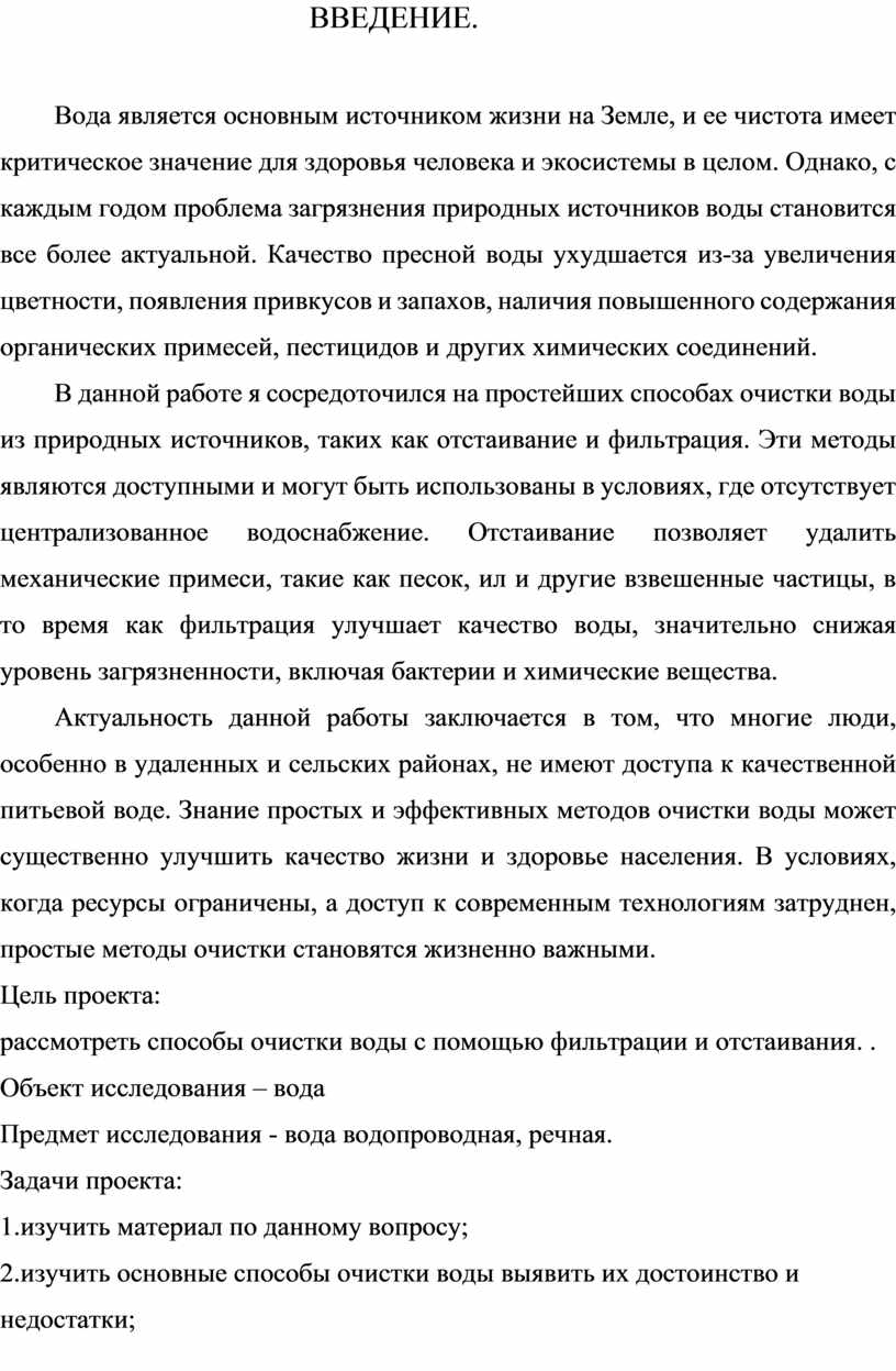 В данной работе я сосредоточился на простейших способах очистки воды из природных источников, таких как отстаивание и фильтрация. Эти методы являются доступными и могут быть использованы в условиях, где отсутствует централизованное водоснабжение. Отстаивание позволяет удалить механические примеси, такие как песок, ил и другие взвешенные частицы, в то время как фильтрация улучшает качество воды, значительно снижая уровень загрязненности, включая бактерии и химические вещества.