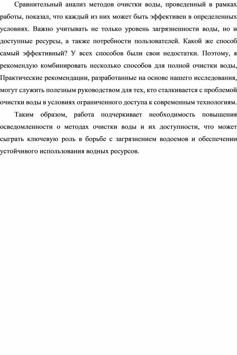 Таким образом, работа подчеркивает необходимость повышения осведомленности о методах очистки воды и их доступности, что может сыграть ключевую роль в борьбе с загрязнением водоемов и обеспечении устойчивого использования водных ресурсов.