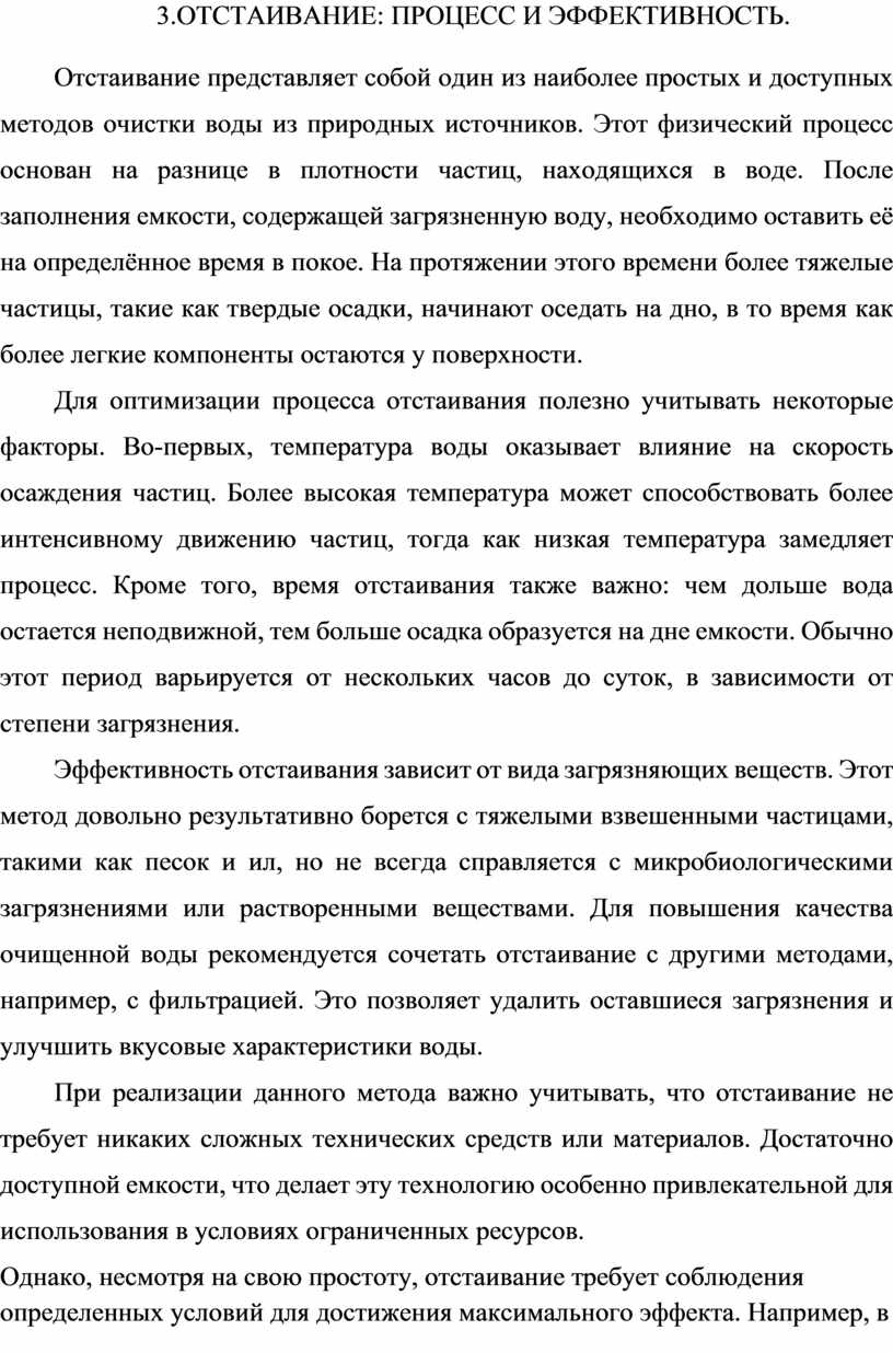 В ходе нашего исследования я рассмотрел два основных метода очистки воды: отстаивание и фильтрацию. Затронули вопросы очистки воды в домашних условиях и на природе. Эти методы являются простыми и доступными, что делает их особенно ценными для использования в условиях, где нет возможности применять сложные технологии очистки. Отстаивание, как мы выяснили, позволяет эффективно удалять механические примеси, такие как песок, ил и другие взвешенные частицы. Этот процесс требует минимальных затрат и может быть реализован практически в любых условиях. Однако, следует отметить, что отстаивание не устраняет химические загрязнители и микроорганизмы, что делает его недостаточным для полной очистки воды.
