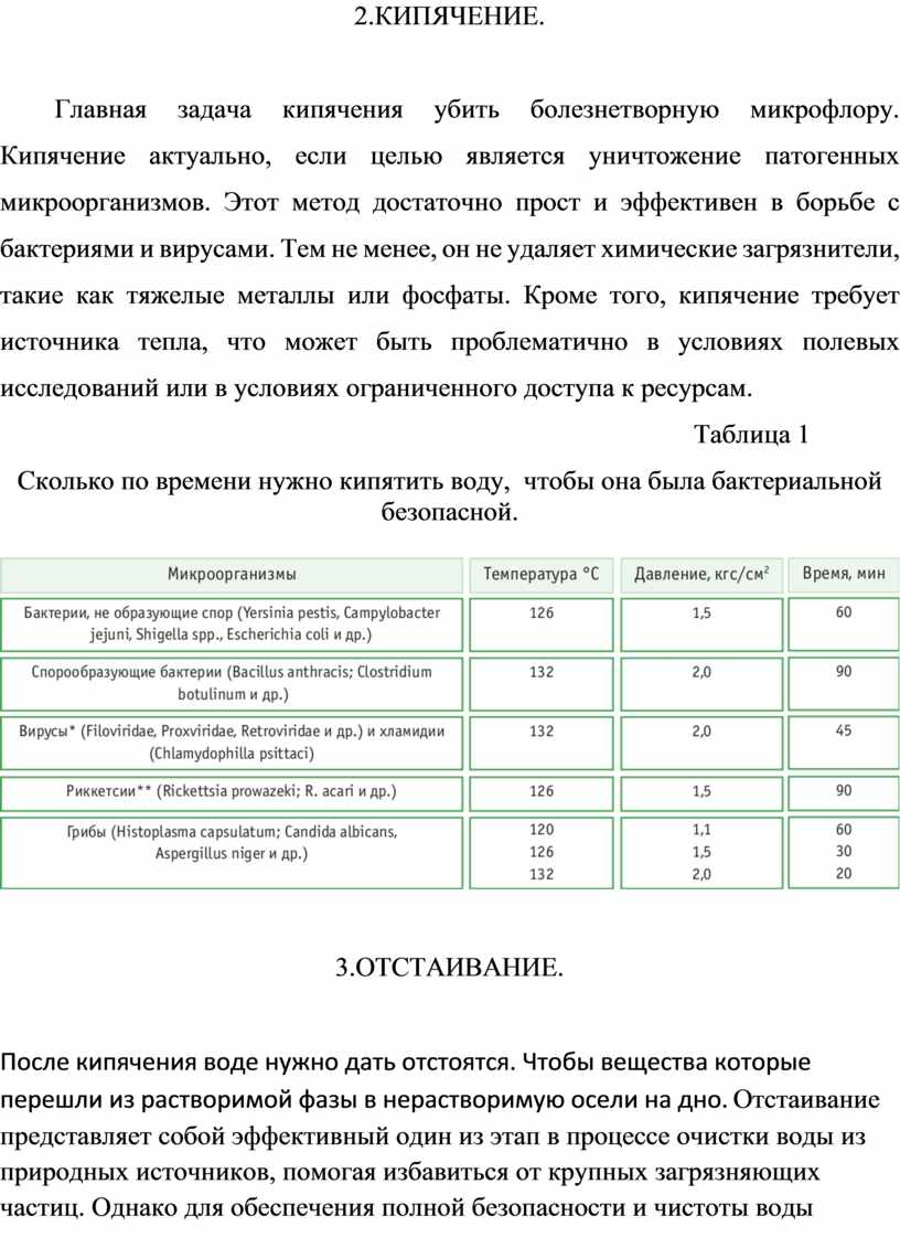 Главная задача кипячения убить болезнетворную микрофлору. Кипячение актуально, если целью является уничтожение патогенных микроорганизмов. Этот метод достаточно прост и эффективен в борьбе с бактериями и вирусами. Тем не менее, он не удаляет химические загрязнители, такие как тяжелые металлы или фосфаты. Кроме того, кипячение требует источника тепла, что может быть проблематично в условиях полевых исследований или в условиях ограниченного доступа к ресурсам.