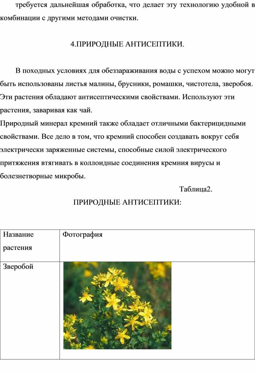 В походных условиях для обеззараживания воды с успехом можно могут быть использованы листья малины, брусники, ромашки, чистотела, зверобоя. Эти растения обладают антисептическими свойствами. Используют эти растения, заваривая как чай.