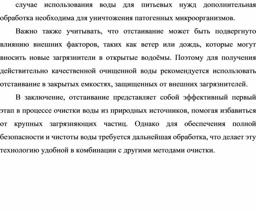 В заключение, отстаивание представляет собой эффективный первый этап в процессе очистки воды из природных источников, помогая избавиться от крупных загрязняющих частиц. Однако для обеспечения полной безопасности и чистоты воды требуется дальнейшая обработка, что делает эту технологию удобной в комбинации с другими методами очистки.