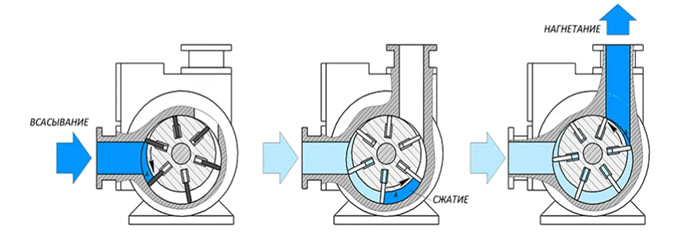 Перекачивание жидкости организовано за счет центробежной силы.